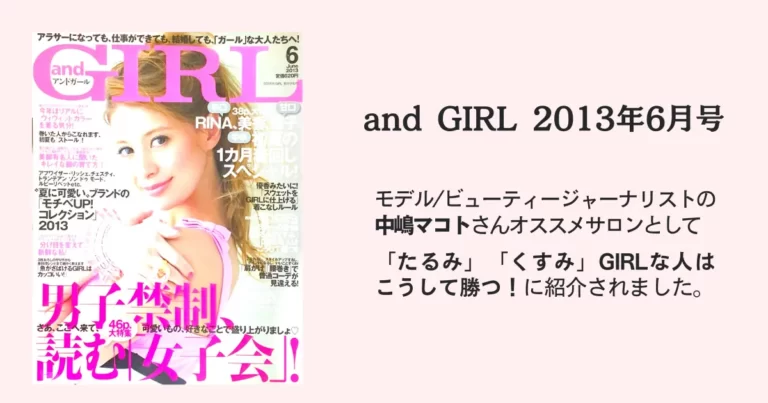 モデル/ビューティージャーナリストの中嶋マコトさんオススメサロンとして「たるみ」「くすみ」GIRLな人はこうして勝つ!に紹介されました。
