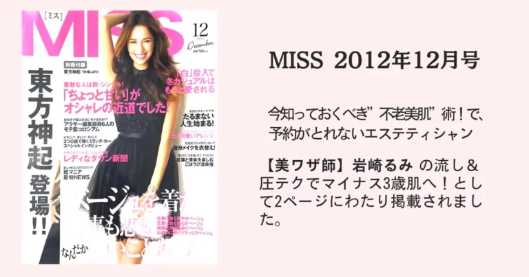 今知っておくべき”不老美肌”術!で、予約がとれないエステティシャン【美ワザ師】岩崎るみ の流し&圧テクでマイナス3歳肌へ!として2ページにわたり掲載されました。